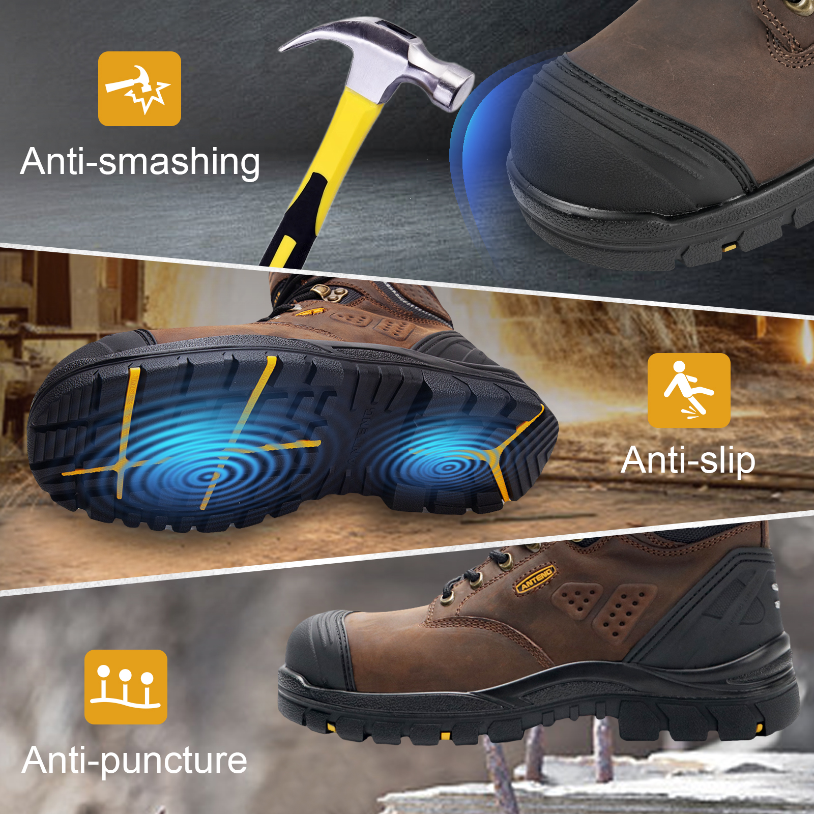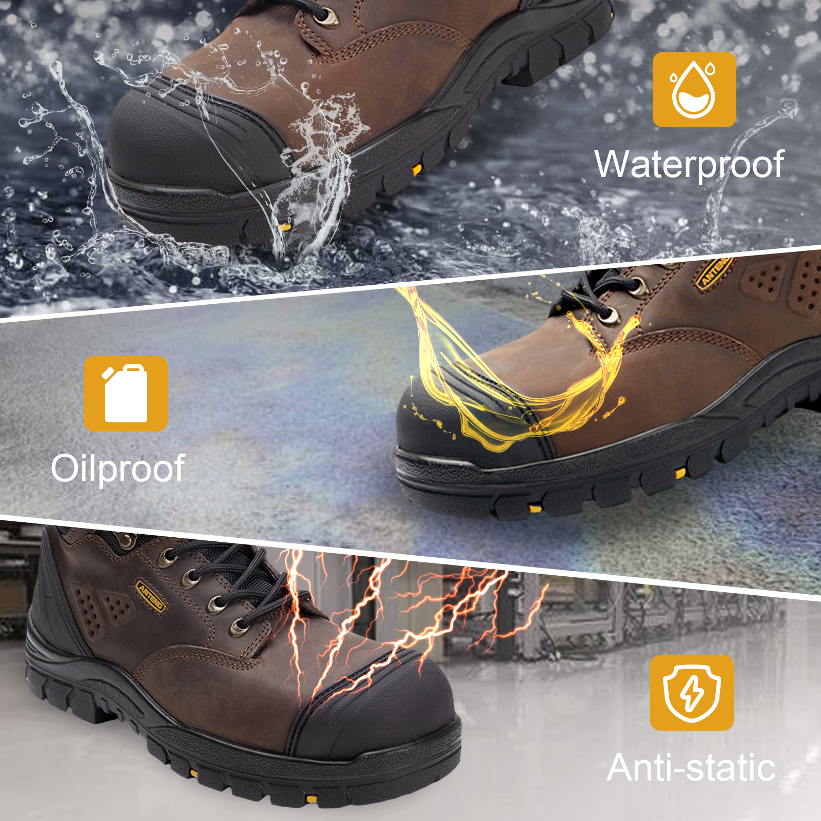 ANTENG 100% Genuine Leather Waterproof SAFETY WORK BOOTS S1P ESD for Men &Women