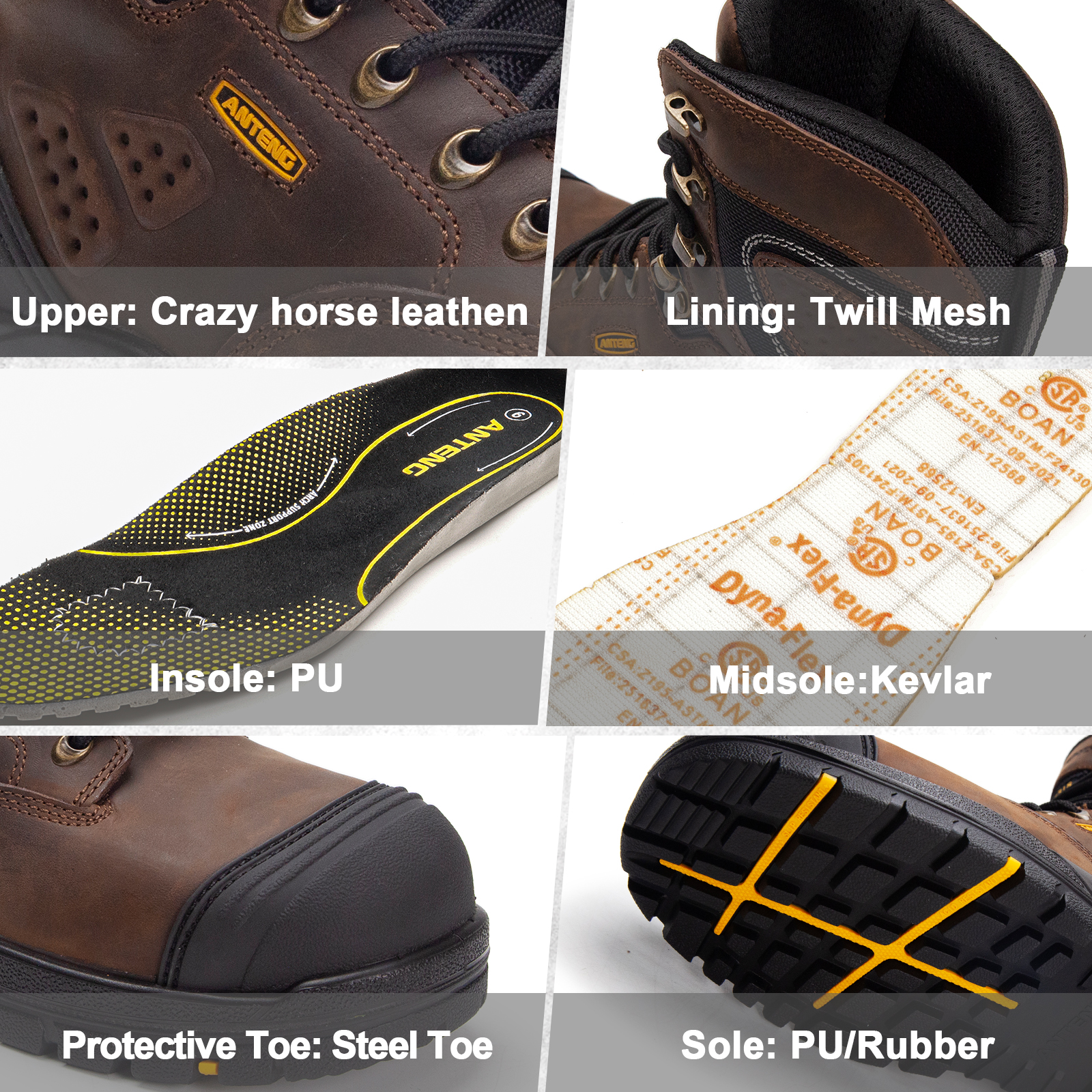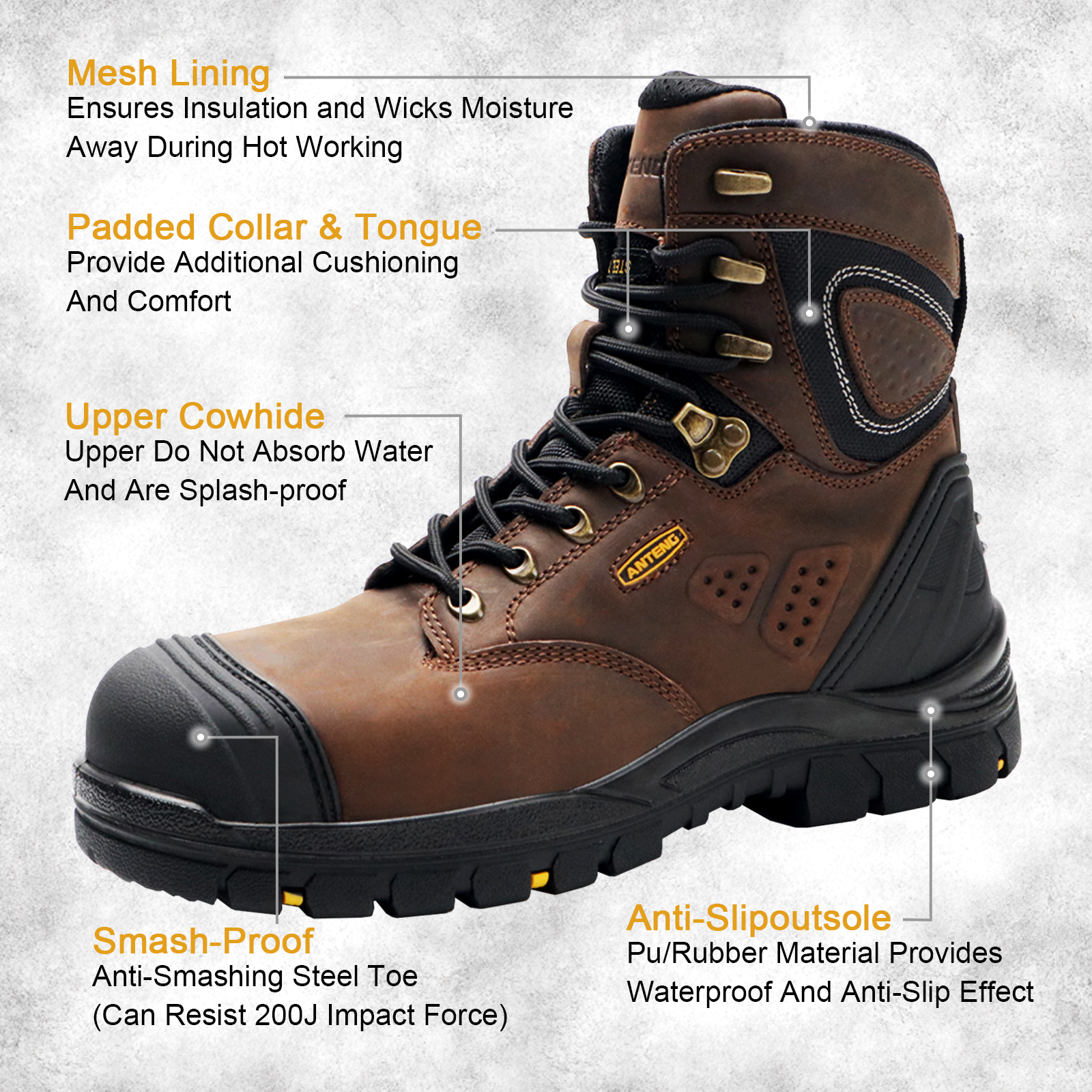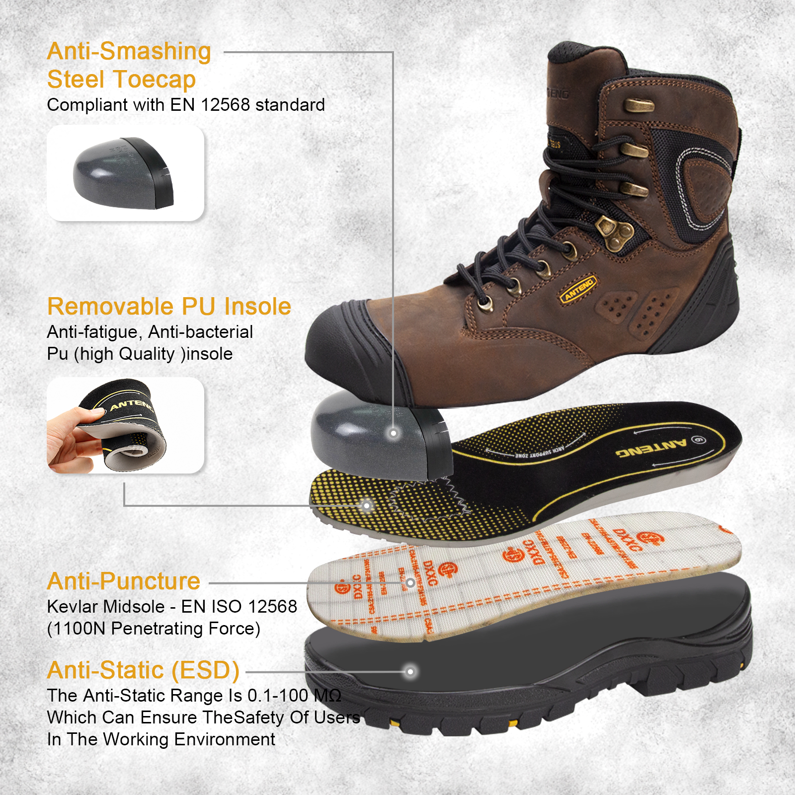 You are here: Home » Products » Foot Protection » Breathable Safety Shoes » ANTENG 100% Genuine Leather Waterproof SAFETY WORK BOOTS S1P ESD for Men &Women
